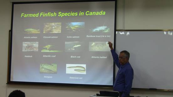 Santosh P. Lall教授系统性地介绍了鱼类在整个生活史过程中不同阶段对于蛋白质、脂肪、维生素等营养物质的需求利用情况,并从全球的视角分析了鱼粉、鱼油等资源在水产饲料中的利用现状,以及未来资源不足的情况下对于鱼粉、鱼油等进行替代的问题。他关于鱼类营养学研究以及未来发展方向的观点,以及其科学、严谨的态度,让同学们受益匪浅。提问阶段,大家就目前实验中遇到的问题以及对于水产动物营养未来发展的看法与Santosh P. Lall教授进行了广泛热烈地交流讨论。