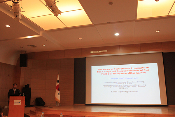 of Testosterone Propionate on Sex Change and Steroid Hormones of Rice-Field Eel, Monopterus Albus (Zuiew)”为题的学术报告。该报告首次系统阐述了丙酸睾酮对黄鳝类固醇激素的分泌和性逆转的影响,报告受到国际同行的高度评价。同时,储张杰博士和我校其他三位专家一道与韩国全罗北道水产技术研究所、全罗南道海洋水产科学研究院相关专家进行交流,并与韩国群山大学相关教授就鱼类繁育和养殖水质调控技术研究达成合作意向。(中文av