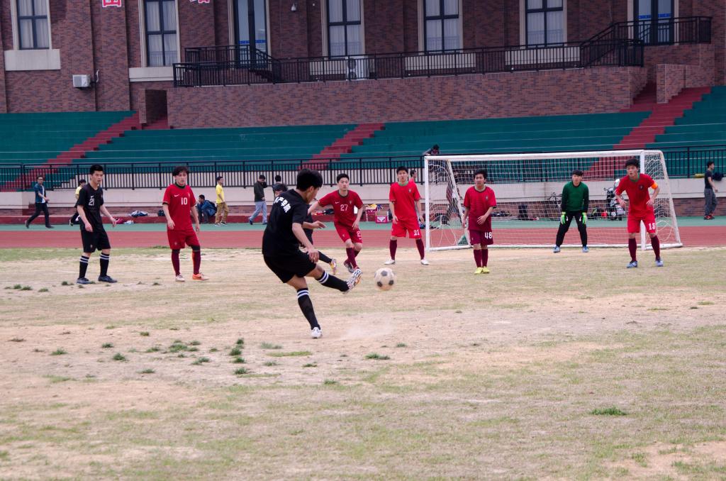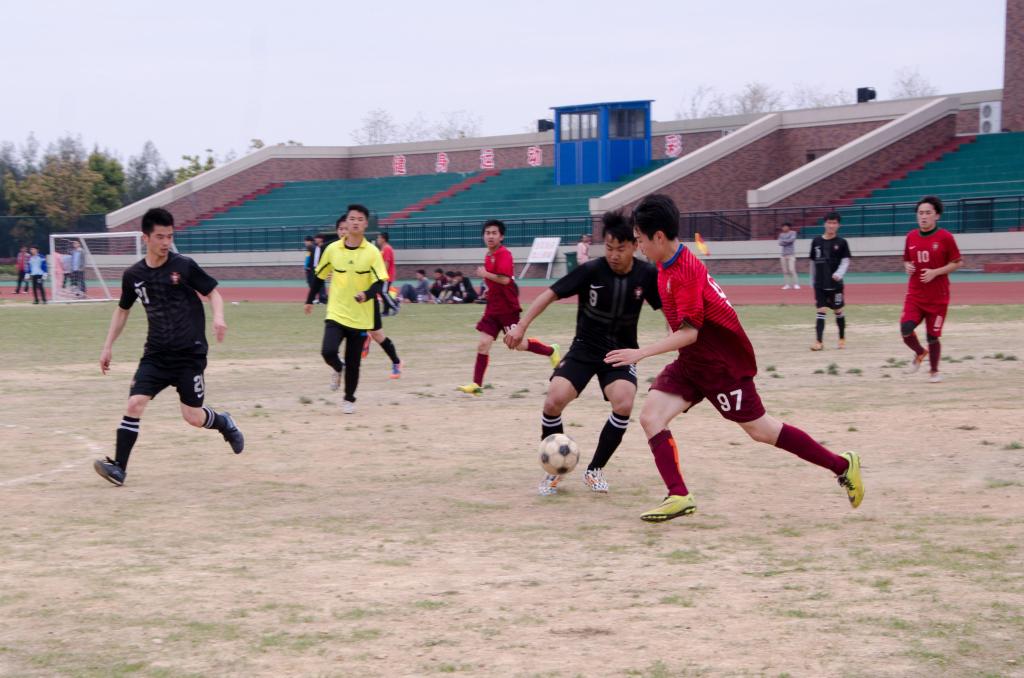 由大一、大二和大三学生组成的7人男子足球队在足球场外围跑道上进行全方位的热身运动,为即将开始体力和速度比拼的足球赛做好充分准备。15分钟后,随着主裁判的哨声吹响,这场激烈的足球赛正式拉开序幕。中午室外足球场的气温已达30多度,这对于在足球场上奔跑的运动健儿们体力的极大考验。在开场20分钟后,大一海渔班魏光麒首进一球的画面振奋人心,他还兴奋地亲吻球服上“中文av