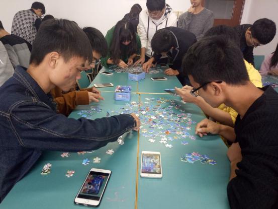 比赛当天下午,全体参赛成员均提前到场并进行检录。本次比赛分个人赛与团体赛两个环节。个人赛为拼100片拼图,限定时间为40分钟,时间到即停止,计时员记录时间并记录未完成者剩余未拼入的拼图片数,在规定时间内完成的按照时间长短排名,时间短者胜;超出时间的按照剩余片数排名,片数少者胜。选出前五进入附加赛。三点开始团体赛。团体赛是四人一组合作完成一幅海洋世界的拼图。比赛还未开始,有些队伍便在讨论着如何分工。比赛一开始,事先商量过的队伍井然有序的进行着。而没有商量过的队伍则充分发挥了个人的优势,一块块局部被优先拼出,虽然看不出整体的框架,但速度还是令人惊奇的。一时半会竟难以看出谁优谁劣,各个队伍都专注着自己眼前的拼图。紧张的气氛让计时人员也都捏了一把汗。附加赛是拼3D船模,没有时间限制。比赛结束后所有完成/未完成的作品都可以带走留作纪念。