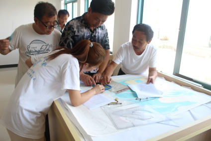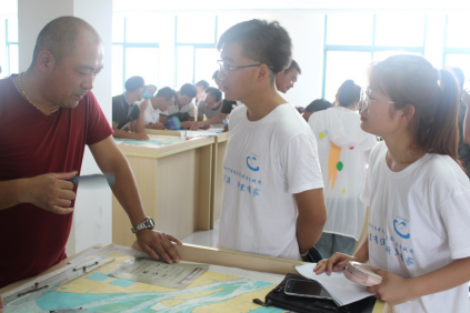 进入培训基地,队员们被门前堆满着的厚厚的海图所吸引,教室内的渔民在培训如何合理设置航线。团队成员随即进入教室向他们介绍了我实践队以及此行的目的,并向他们发放《倡议书》、宣传扇等,讲解最新休渔制度和护渔相关知识。在他们的积极配合之下,团队成员很快完成了培训基地的问卷调查。