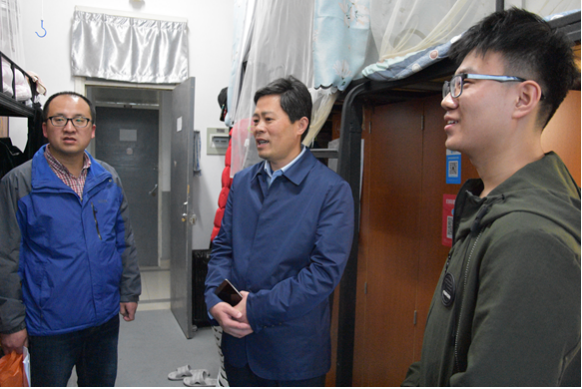 养殖系学生党支部及学生寝室走访。郑老师十分关心学生的学习生活情况,每到一个宿舍,都与同学们进行了亲切的交谈,关心同学们的思想、生活、学习及就业准备情况,特别是针对同学们提出来的问题,他认真记录并详细询问。