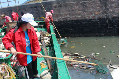 “海清鱼丰”实践团队队员们拜访了杨世钗先生,参观了清道夫海洋环保有限公司,并随杨先生登上沧海9号垃圾打捞船。队员们出海打捞近海海面垃圾,并将打捞上来的垃圾进行分类处理。