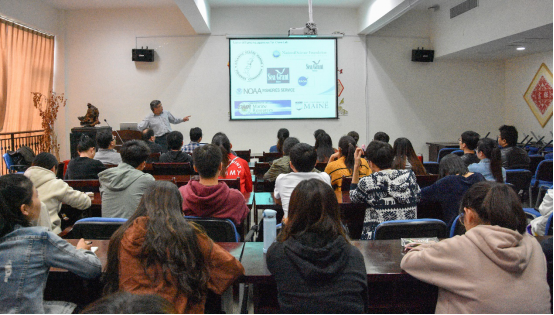 随后,陈勇教授第一场学术报告正式开始,报告会上,陈勇教授首先介绍了渔业管理要以保持资源生产力和促进资源的有效利用为目标,以及应该怎么去实现这个目标。紧接着陈教授以缅因湾龙虾种群为例重点介绍了一些可以提高渔业的气候脆弱性和恢复力的建模方法,深入浅出,生动形象。