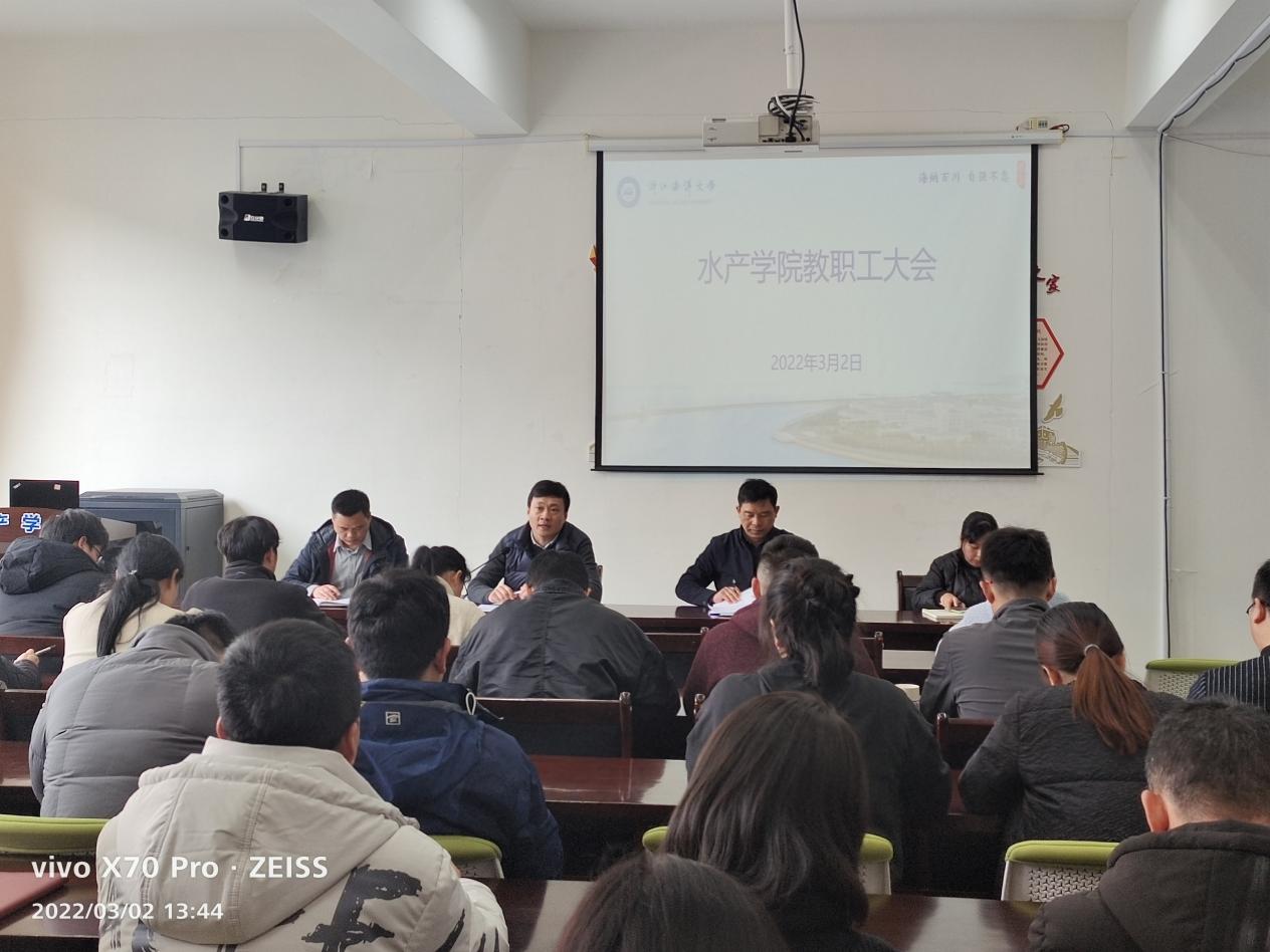 在海科楼263报告厅召开2021-2022学年第二学期期初全院教职工大会。会议由院长王迎宾主持,党委副书记虞浩臣、副院长钱卫国、徐娜娜及全院教职工参加本次会议。