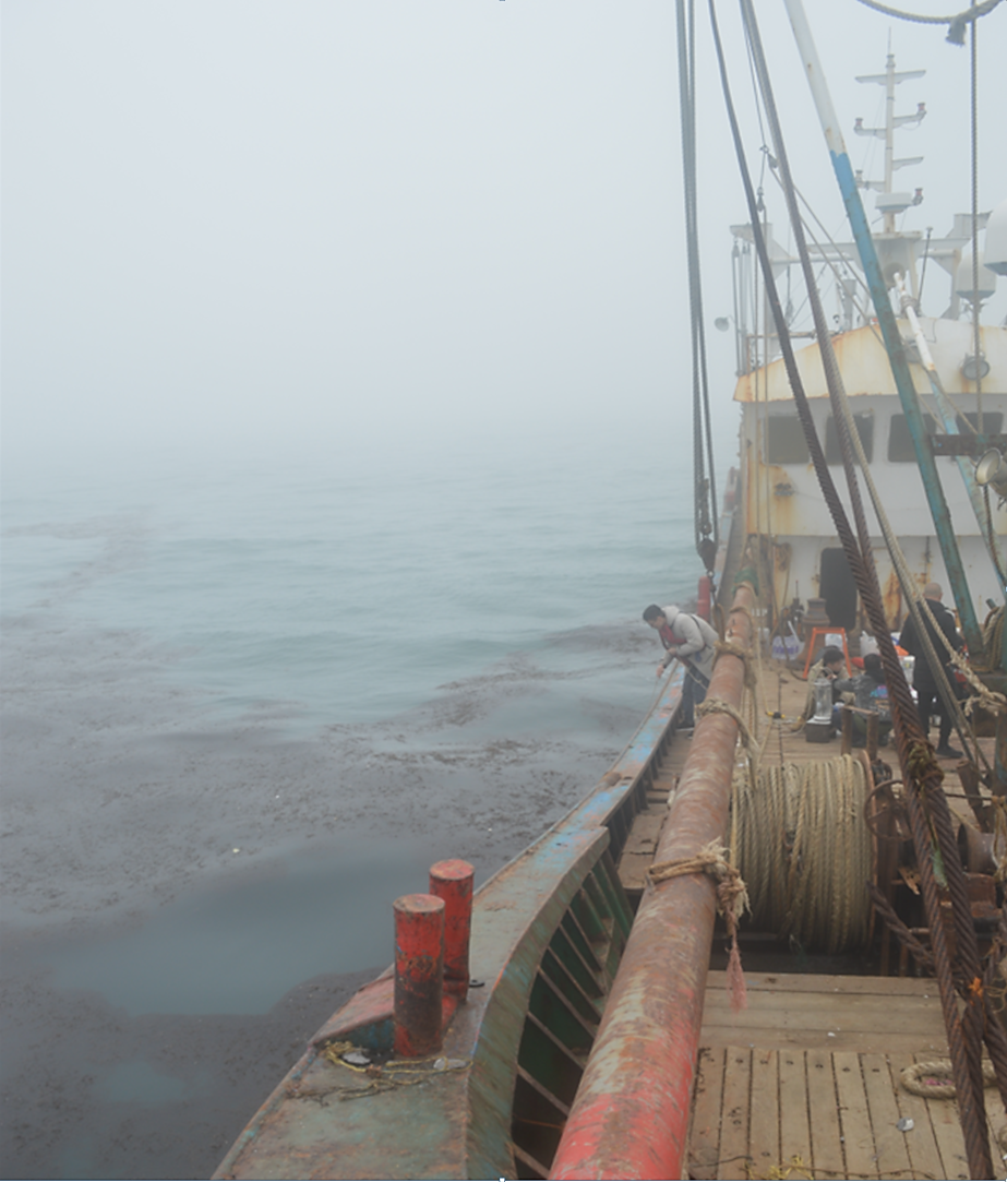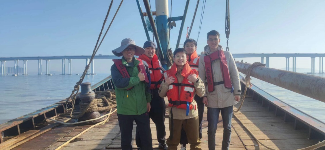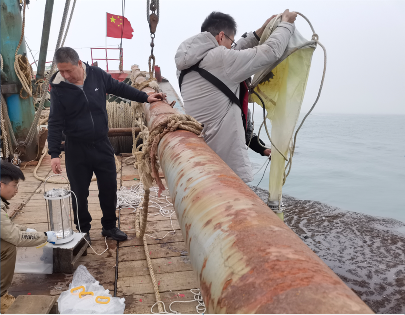 “海洋牧场与渔业碳汇生态功能创新团队”5名师生搭乘调查船,克服了海上平流雾等突发恶劣天气影响,沿北纬30°一线向东开展了漂流藻追踪调查,航程近100海里,完成了多个海上漂流藻团的追踪及站点取样工作。