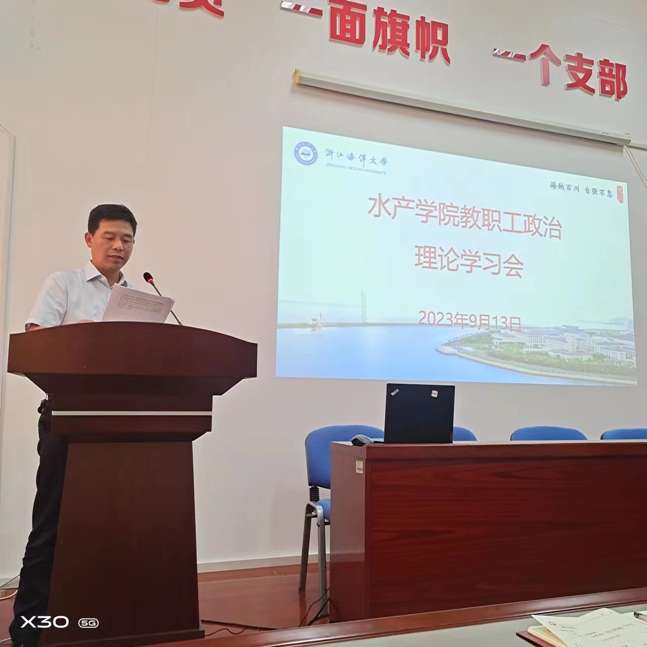在海科楼141室召开了全院教职工政治理论学习会。学院党政领导和全体教职员工出席会议,会议由学院党委书记虞浩臣主持。
