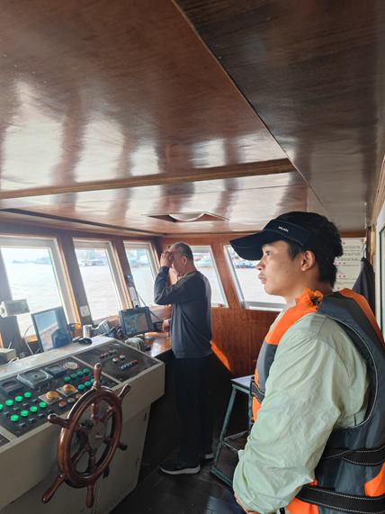 在网具制作中,两校学生在计算浮、沉子比例、纲索制作时通力合作,共同制网,获得了很好的合作效果。在出海前,叶老师和李老师讲解了如何利用仪器去测量拖网的曳纲张力、网口高度,如何使用纸质海图等问题,并且教授了相关知识技能。在渔船上,张健老师指导了如何利用助渔仪器获得航速、航向等相关数据,通过数据分析网具的情况及产生问题的原因,便于后期对网具修改和优化。