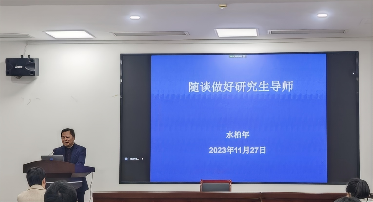 水柏年围绕“做好双向选择、倾心培养人才、抓住关键环节、不拘一格培养”等四个方面内容,以个人十几年的研究生导师指导实践与全体导师分享交流如何指导研究生做人、做事、做学问。他强调每一位导师都应该认真了解学生的发展意愿以及个人能力,因材施教,为他们制定合适的培养计划。在培养过程中,导师应当抓住关键环节,明确研究生培养方向,指导学学业生涯规划,锻炼学生科研能力和实践能力,使其养成严谨的治学态度。在传授学生专业知识、指导做学问的同时,还应不忘教其做人与做事的道理。此外,一个优秀的导师团队应该建有符合自己团队实际情况的规章制度,并严格执行。他说作为新时代的研究生导师,当好学生们的“四个引路人”是时代赋予我们的光荣使命,指导学生走好成长之路,关注并为学生谋划出路,多途径铺就学生就业之路是每位导师的职责。