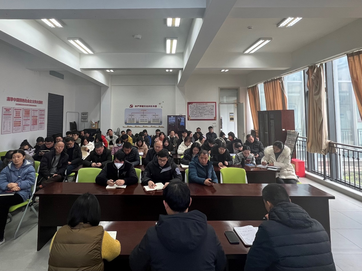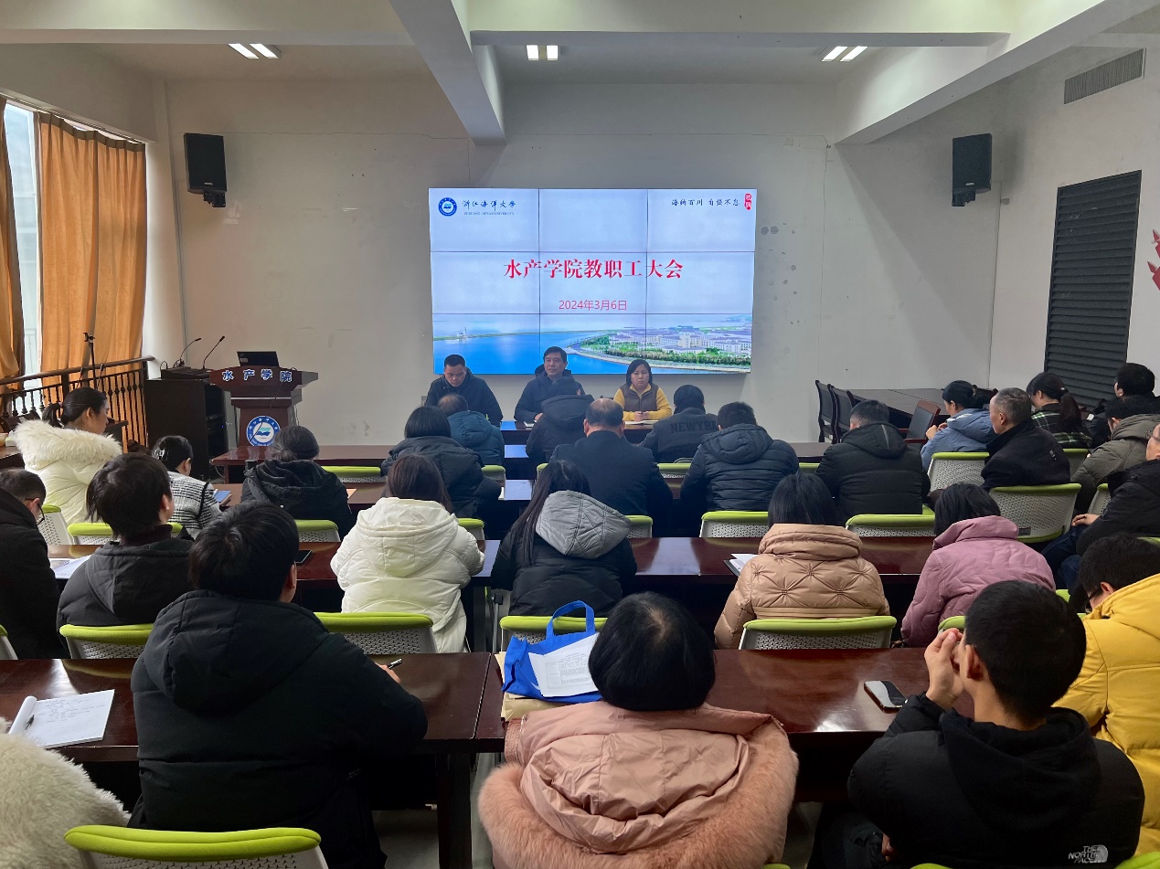 在海科楼263会议室召开2024年新学期教职工大会。学院党委书记虞浩臣主持会议并讲话,副院长钱卫国、徐娜娜等党政领导出席,全院教职员工参加会议。