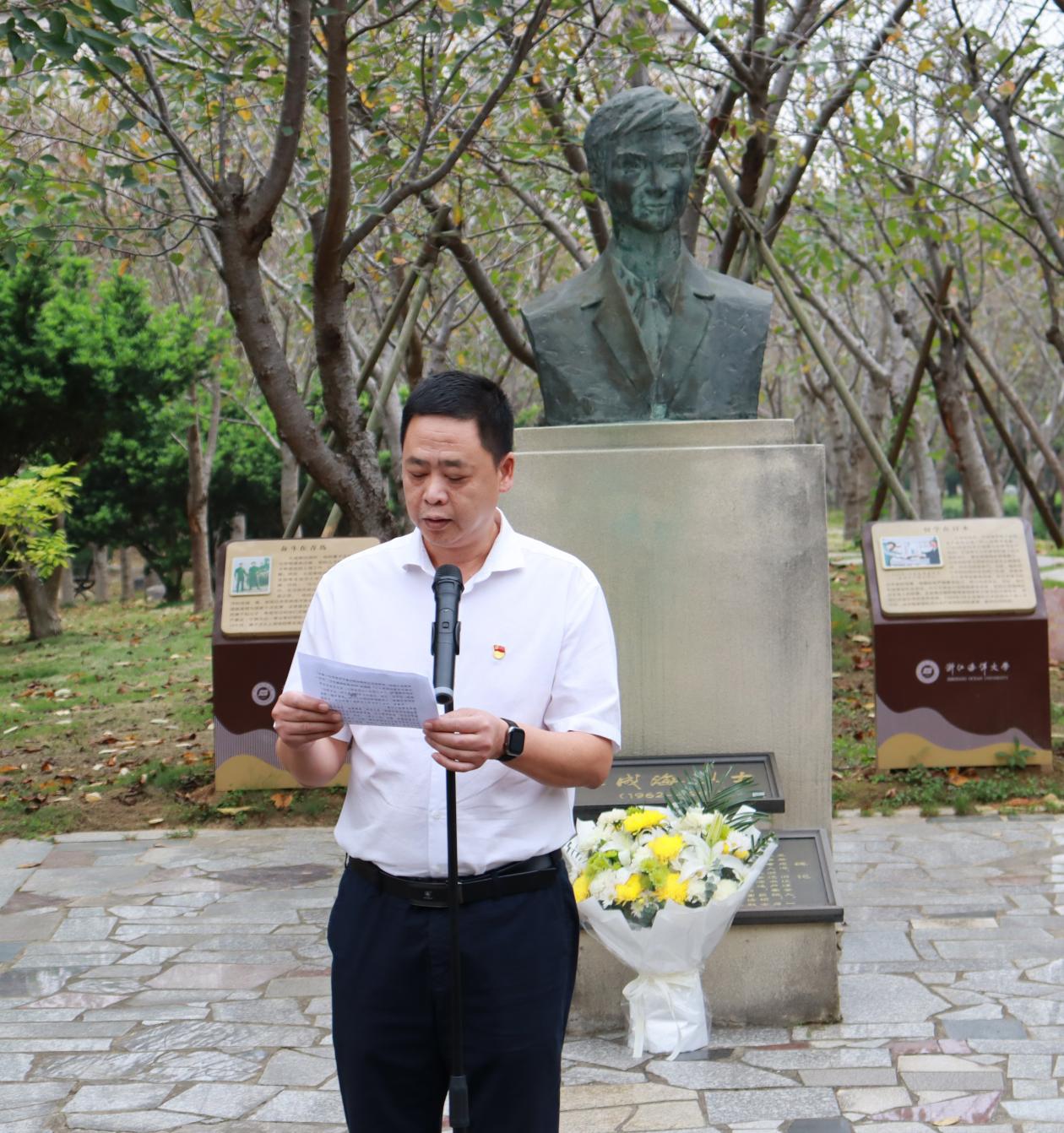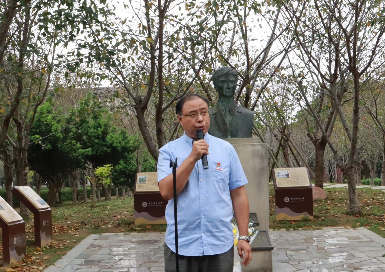 党委书记薛利建同志致追思辞,深情回顾王成海烈士生平,号召师生学习其英勇无畏的精神,传承红色基因,激发爱国热情。薛利建表示:王成海烈士以短暂的生命轨迹向祖国、人民交上了一份满意的答卷,“成海精神”已经深深融入海大的文化血脉中,为我们提供了丰富的精神寄托和文化滋养。激励我们不忘初心、牢记使命、勇担责任、追求卓越。