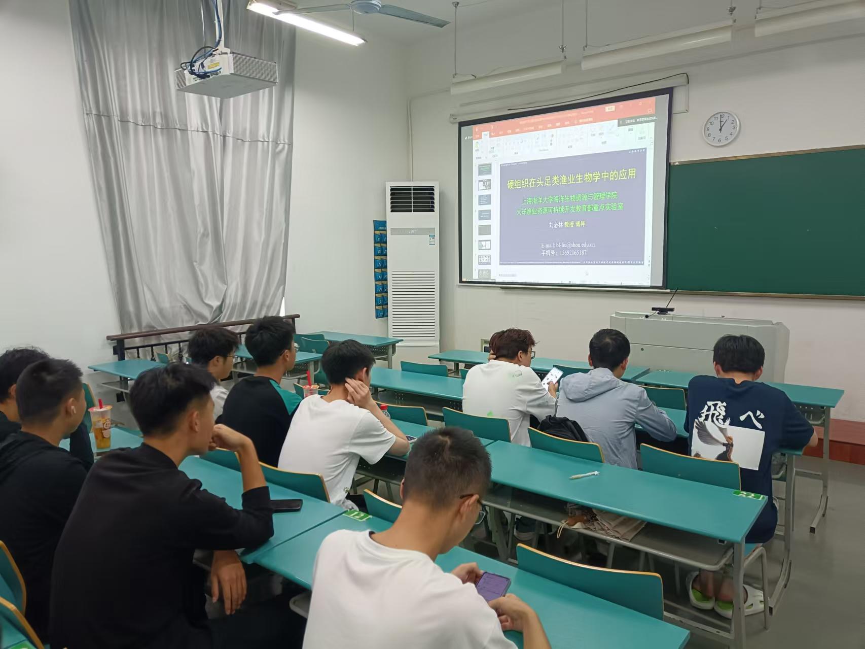 师生积极参加海洋渔业科学与技术专业核心课程群虚拟教研室平台举办的“海渔大讲堂”,本次授课教师为海洋渔业领域知名专家刘必林教授,讲座报告主题为“硬组织在头足类渔业生物学中的应用”。
