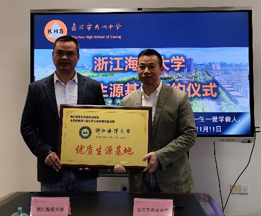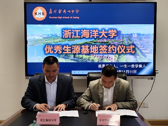11月11日上午,与百年老校浙江省嘉兴秀州中学实现优质生源地合作签约。秀州中学周崴书记、校办朱则近主任参加本次活动。两校默契以“海纳百川”的治校精神合作培养8位涉海学生,教育学生“一生一世学做人”。