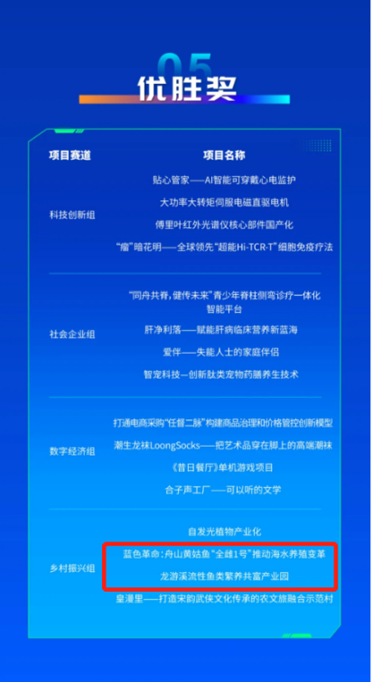 研究生Y23渔发1班胡湘浙《龙游溪流性鱼类繁养共富产业园》、Y23水产帅雁《蓝色革命:舟山黄姑鱼“全雌1号”推动海水养殖变革》项目成功入选40强,进入2024年“创青春”浙江省青年创新创业大赛现场路演。最终,喜获2项优胜奖。