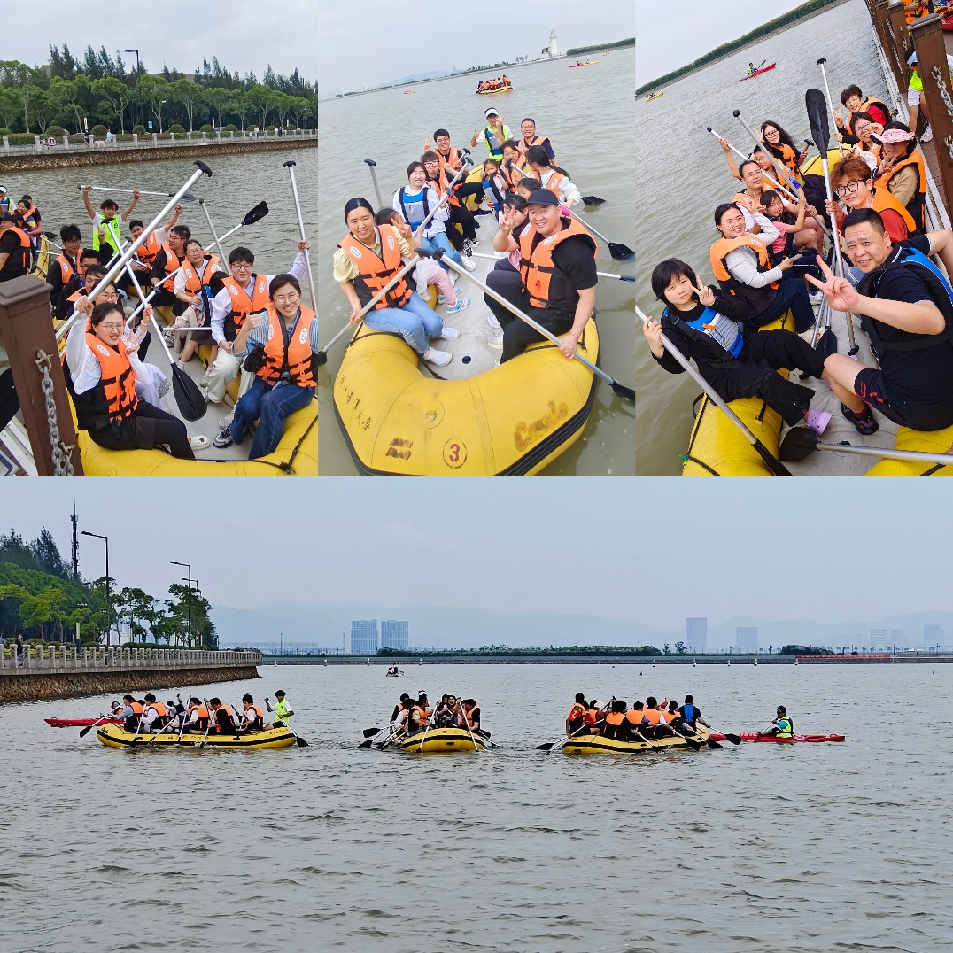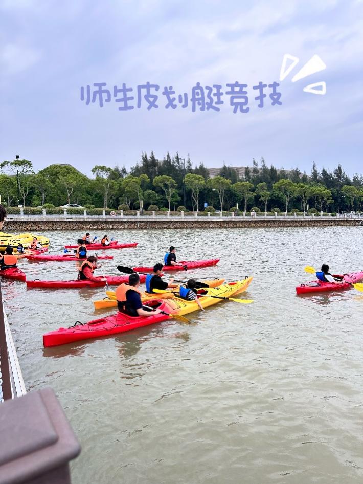 活动开始,体军部讲解员为大家详细讲解了划桨要领和比赛规则。随后,师生们迅速集结成三支斗志昂扬的队伍。首先进行的是多人皮划艇友谊赛,各队在揽月湖上并肩作战,口号响亮,动作整齐划一,朝着共同目标全力冲刺,默契协作中尽显团结力量,师生情谊也在同舟共济中悄然升温。