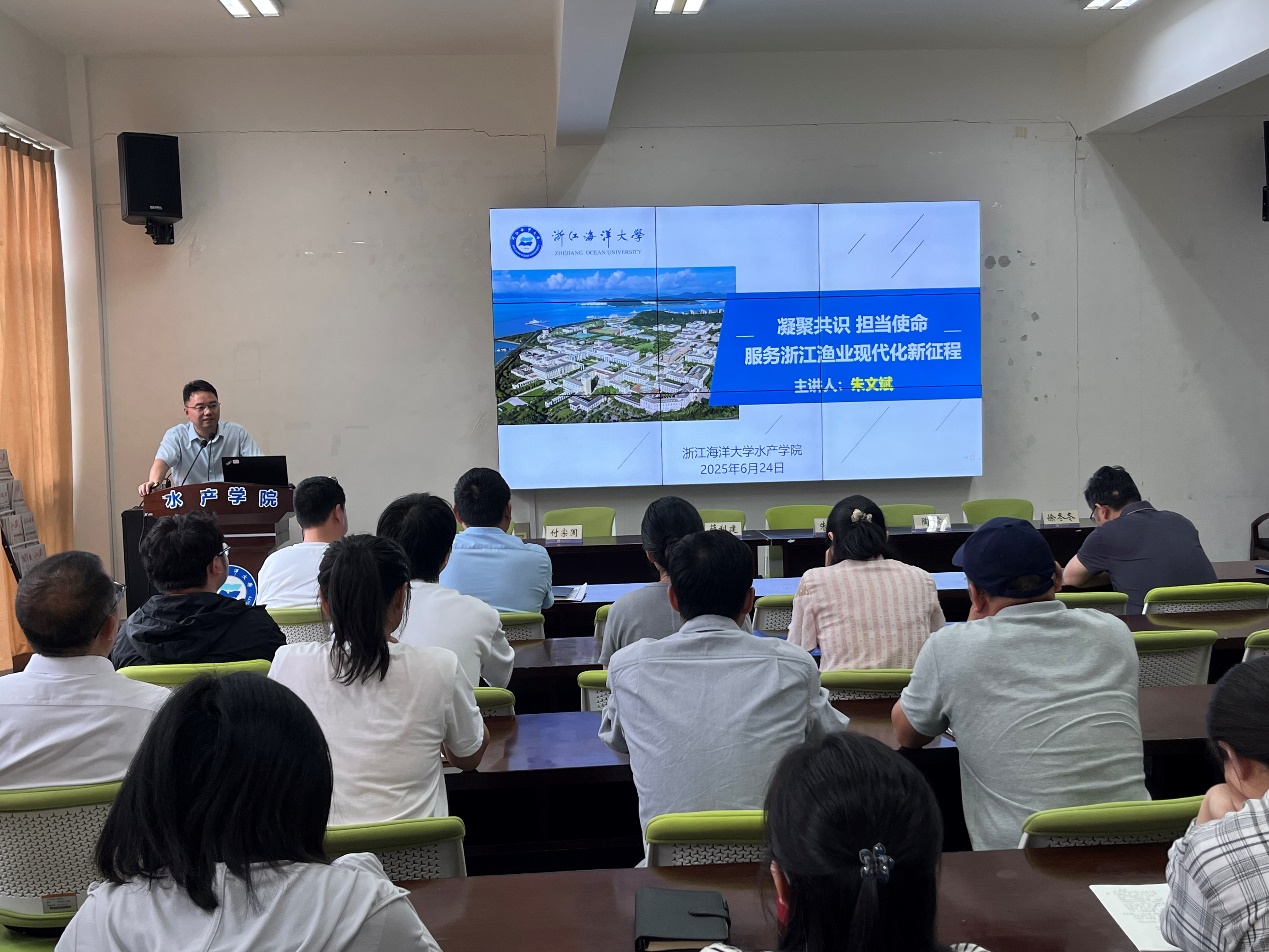 学院副院长朱文斌在会上作题为《凝聚共识 担当使命:服务浙江渔业现代化新征程》的专题报告。他指出,依托浙江海洋生态资源优势和渔业产业特色禀赋,深化实施渔业渔村领域“千万工程”,共同推进浙江全面建设渔业现代化,在奋进中国式现代化新征程上勇当先行者,为渔业高质量发展提供可复制可推广的示范经验。全院教职工要团结一心,共同书写水产学科的新篇章,为构建可持续的“蓝色粮仓”贡献力量!