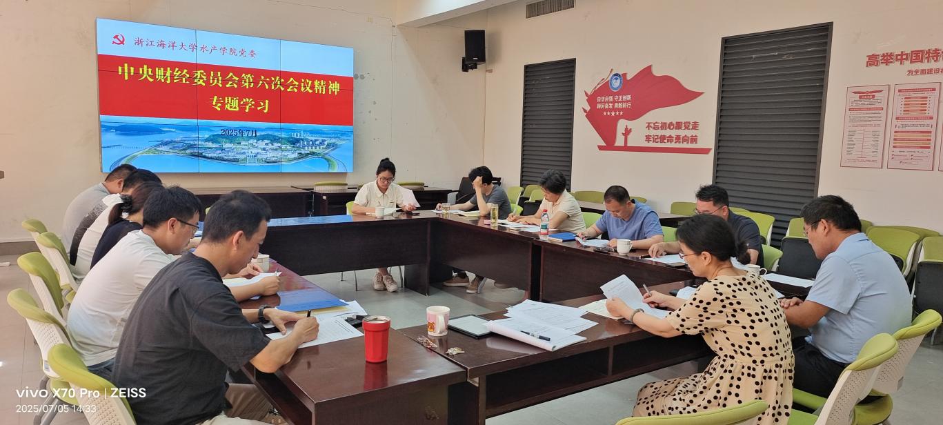 在海科楼263会议室召开党委理论学习中心组(扩大)会议,专题学习贯彻中央财经委员会第六次会议精神,谋划水产学科高质量发展路径。学院党政领导班子、各教学科研团队负责人参会,会议由副院长朱文斌主持会议。