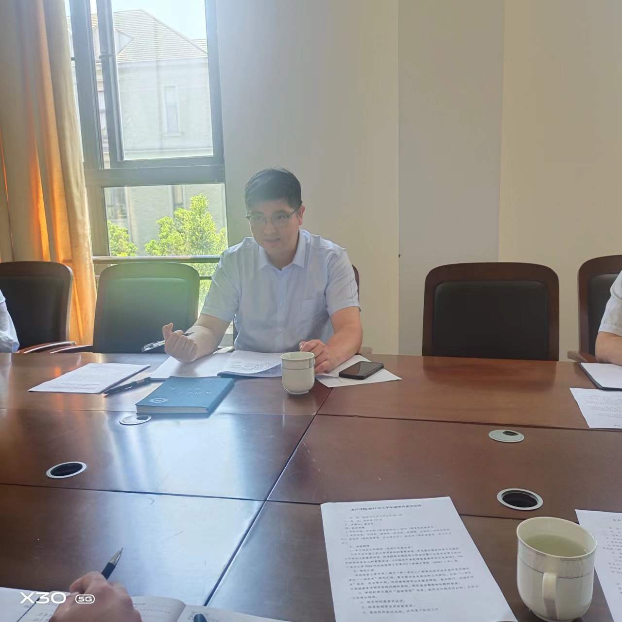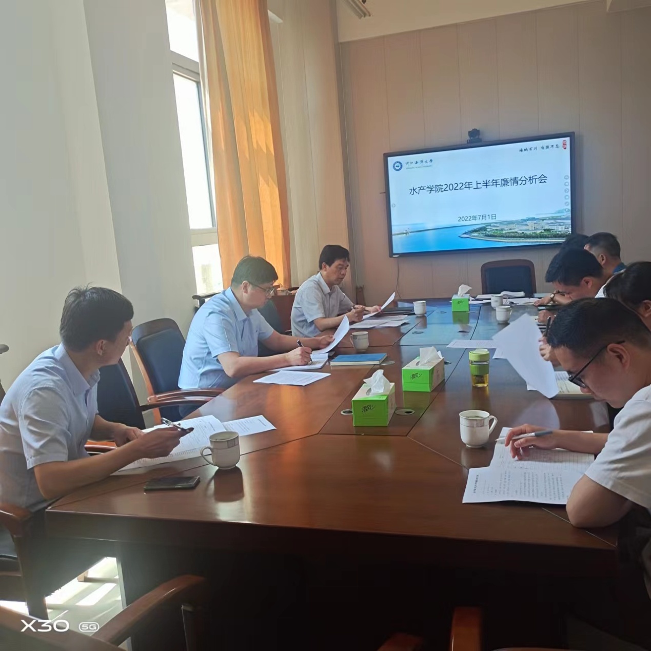 2022年上半年党风廉政建设情况分析会在海科楼263室召开,联系学院的校领导卢金树副校长出席会议并讲话,学院党政班子成员参加会议,学院纪委委员、办公室主任等列席会议。会议由学院党委书记虞浩臣主持。