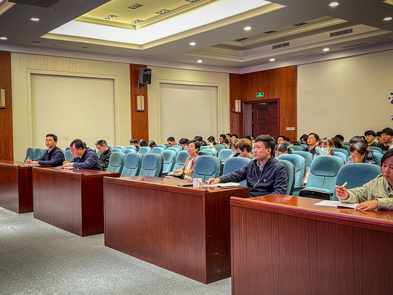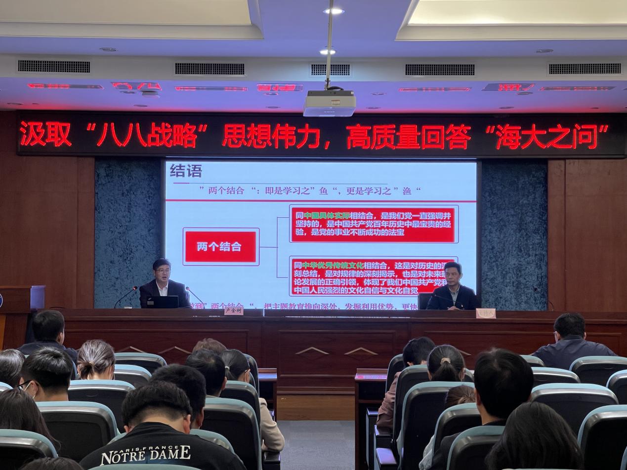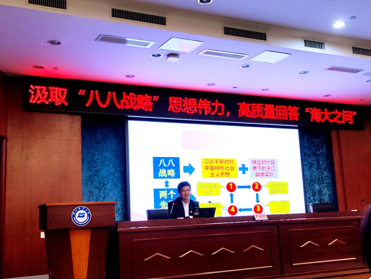 卢金树以汲取“八八战略”思想伟力,高质量回答“海大之问”为题,紧紧围绕深化学习习近平新时代中国特色社会主义思想、深化“八八战略”逻辑理解、深化“海大之问”内涵挖掘、深化“校内校外双循环”办学实践等四个方面内容作了系统而全面的讲解。