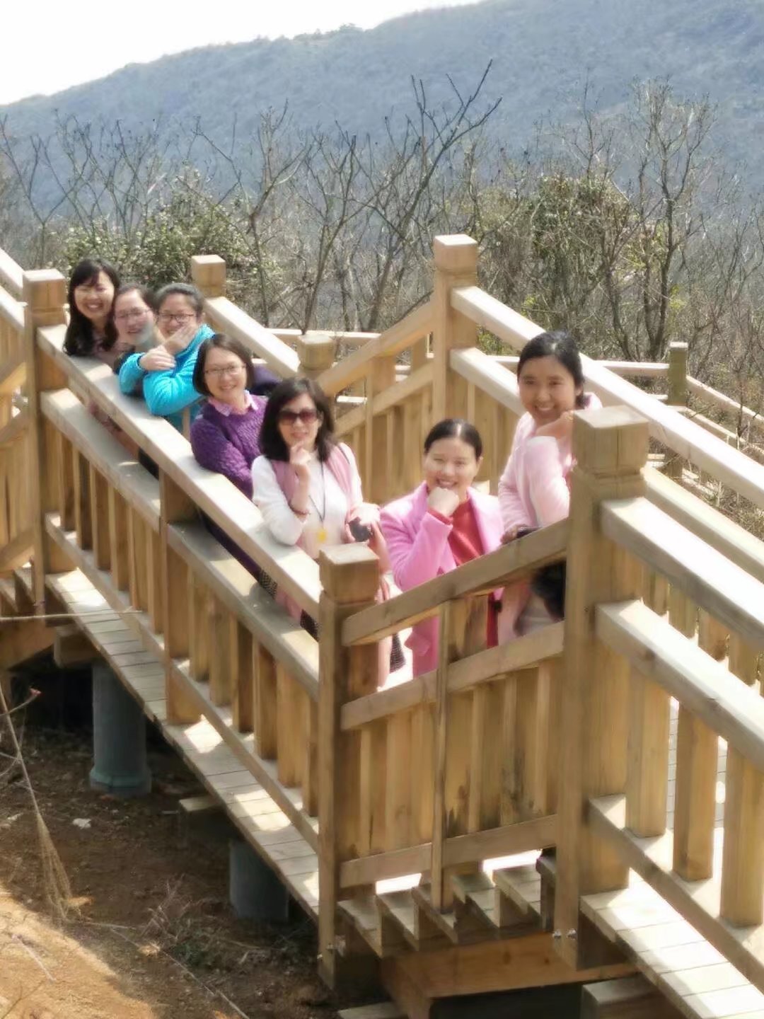 此时的仙人山花发灿烂,一阵和煦的春风拂过,最是惬意,老师们也是赞不绝口。山脚是满眼金黄的油菜花,雪白的李花与粉嫩的桃花在绿草如茵、青松苍翠间竞相绽开。众人均感叹在这样的风景里未爬山,先就有七分愉悦。何况沿途幽兰暗香,沁人心脾,铺天盖地的映山红中,整个心情都是红艳艳的。