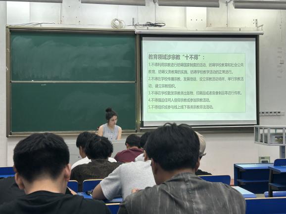 9月19日下午,班助关冬玲在公教118主讲安全课,围绕防范盗窃、诈骗、火灾、交通事故及正确宗教信仰(解读教育领域涉宗教“一分离”“十不得”)、网络安全、廉洁教育展开,强调安全是学习生活前提,要求新生坚守法纪底线,提升安全防范能力。