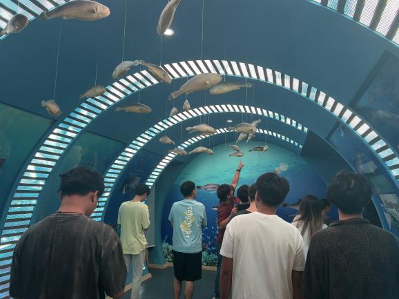 9月18日上午,班助云梦楠、路鹏、张妍妍带领新生前往校史馆,学校特邀讲解员以生动讲解追溯校史、解读海洋特色教育理念,助力新生融入校园文化,深化对学校发展与海洋教育的认知,涵养海洋事业服务情怀。