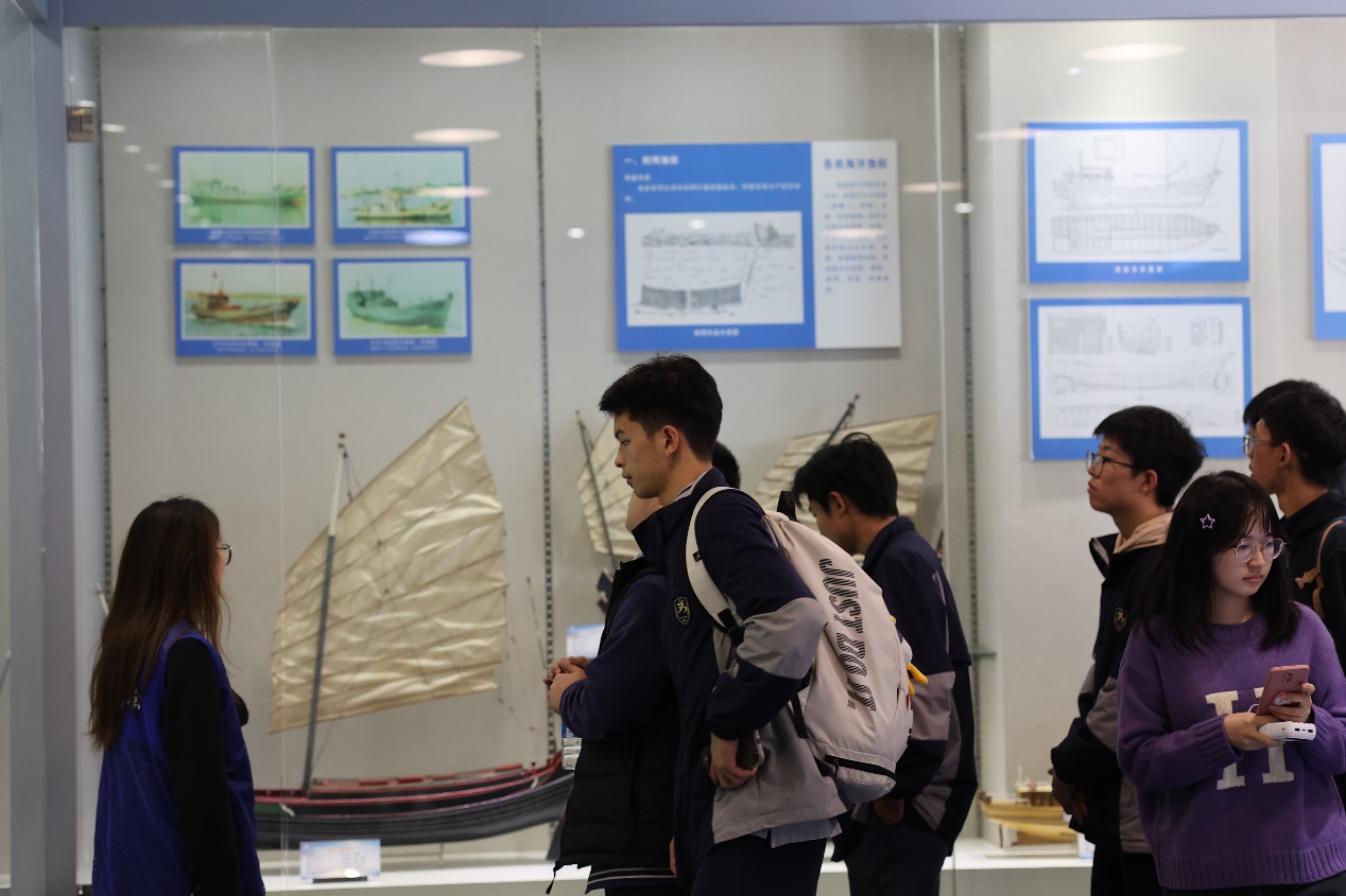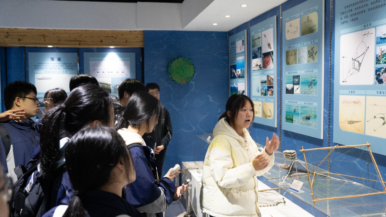 海洋生物标本馆、船模展览馆,渔具展示中心打开“蓝色海洋知识之盒”。蓝幸龙、蒋番娟与宫羽同学以生动凝练的语句,向嘉外学子展示深海常见鱼类、渔船制造史、各类渔船捕捞对象以及全国常见渔具和使用场景。