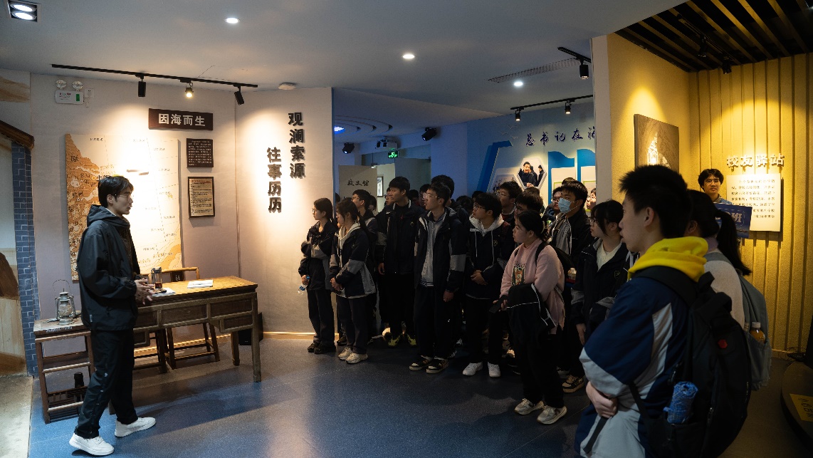 海大校史馆里述说“自强不息,向海图强”。昝凯文讲述我校悠久办学历史、办学理念与未来展望,展示专业师资队伍、科研社会服务成果,积极鼓励嘉外学生坚持顽强拼搏,葆奉献精神。