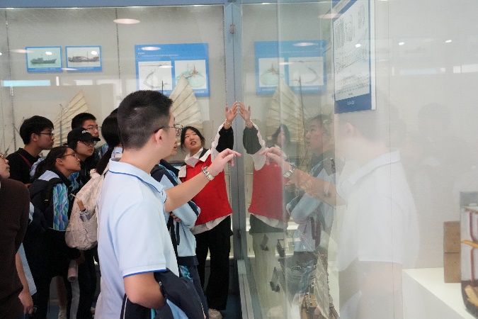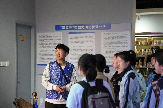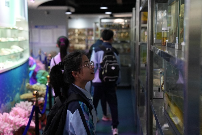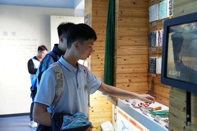 生物标本与多元渔具放彩海洋世界,吸睛满满,引起声声惊叹。同学们驻足标本架前,听展馆志愿者讲解来自深海的奥秘;在多姿渔绳、渔钩、渔网前想象自然的馈赠,感知人与自然和谐共生的默契法则。