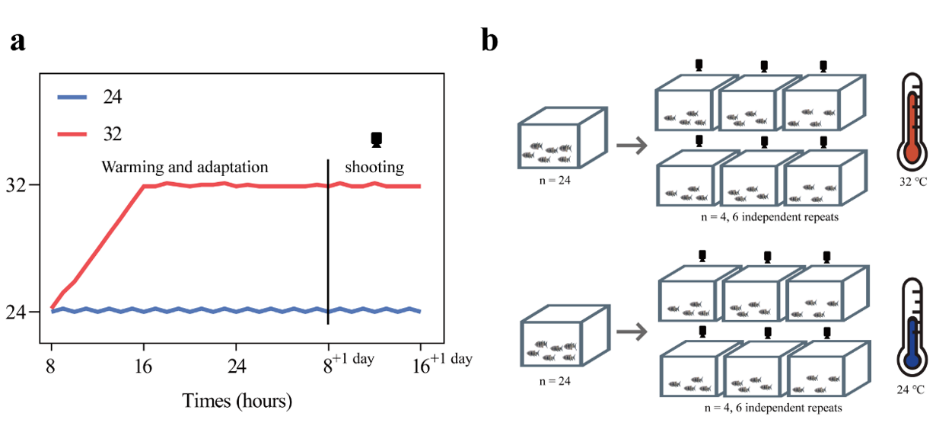 开篇列举十多种样貌奇特、颜色绚丽的淡水、海水鱼,开启现场热烈氛围。随即,以当前气候现状抛出“全球变暖对鱼类行为影响”的互动提问。以科学对照组比对16℃-32℃动态区间内鱼类行为状态,揭示鱼类在高温环境下存在物理避光降温、群体性攻击风险增高导致生存率降低的情况。结合转录组基因组学方法筛选鱼类高温胁迫基因,摸排调控机制助力养殖产业发展。