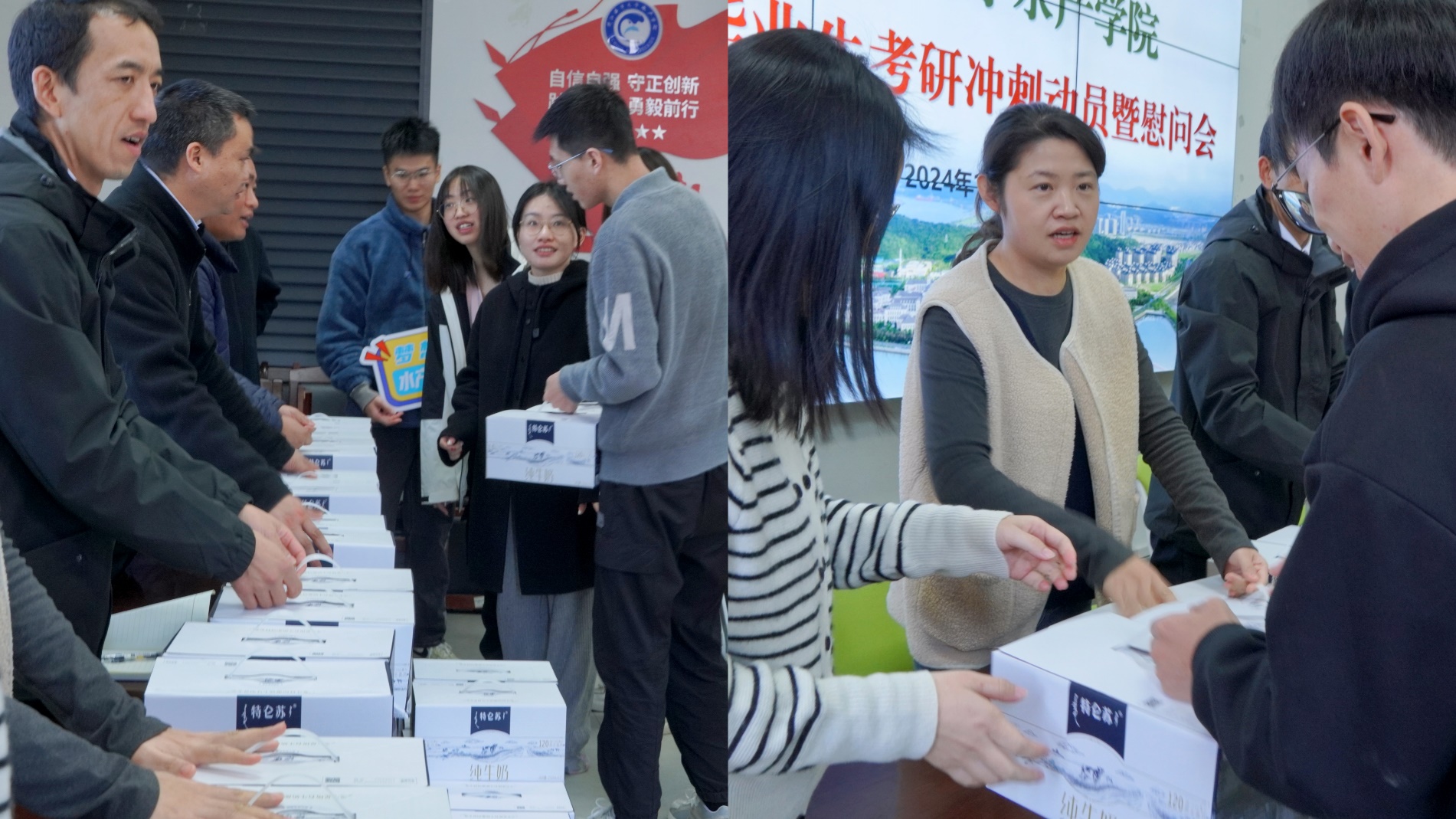 交流结束后,学院领导、班主任代表学院将精心准备的考研加油慰问品逐一递到了考研学子的手中。这些暖心的礼物不仅传递了学院的关怀与支持,也让学子们感受到了家的温暖。考研学子们和学院老师,在“考研必胜”的加油鼓舞声中一起合影留念。2025届的毕业生们表示,他们将更加坚定考研必胜的信心,用实际行动回报学院的关爱与期望,勇敢地迎接未来的挑战。