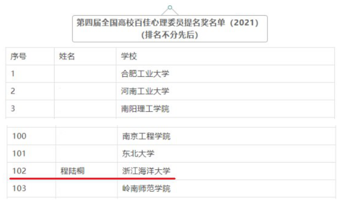 A19海渔班程陆桐同学荣获第四届“全国高校百佳心理委员提名奖”。