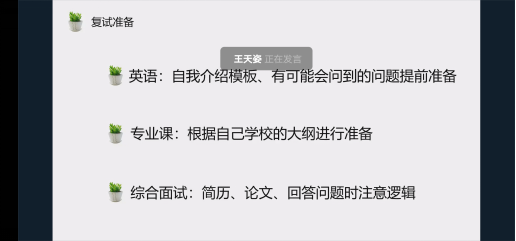 通过网络形式开展了考研复试经验分享会,本次分享会邀请了已经考取大连理工大学的王天姿同学,考取中国海洋大学的杨意馨同学,考取上海海洋大学的解志龙同学和考取中国科学院大学的杨磊同学。