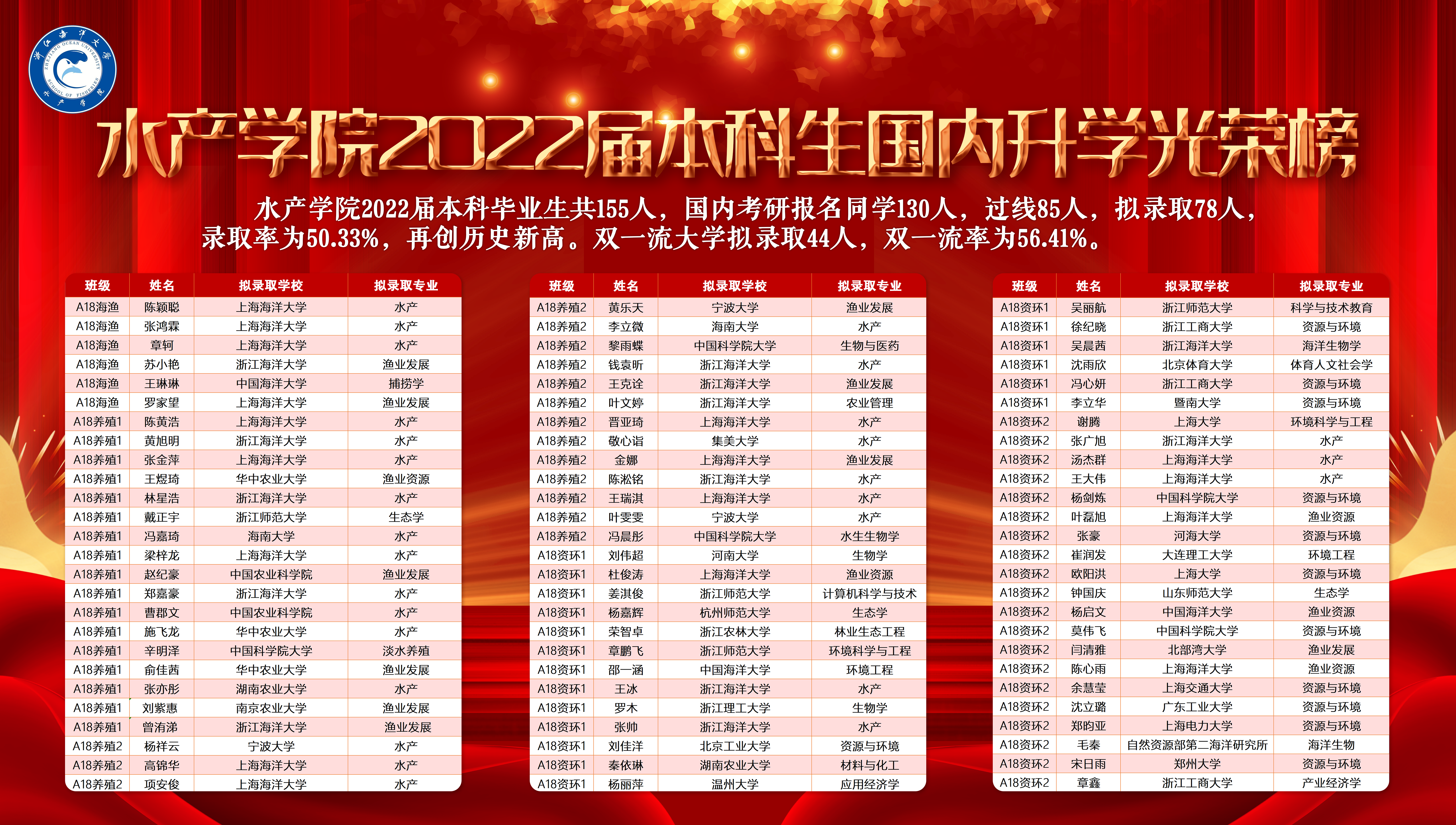 2022届考研学子捷报频传。国内考研报名130人,过线85人,截至目前拟录取78人,录取率为50.33%,再创历史新高。双一流大学拟录取44人,双一流率为56.41%。另有1人已申请到日本东京海洋大学研究生,5人正在申请俄罗斯南乌拉尔大学研究生。这些成绩的取得,既是考研学子寒窗苦读、不懈奋斗的结果,也是学院不断提高教学质量、注重学科建设,坚持三全育人的体现。