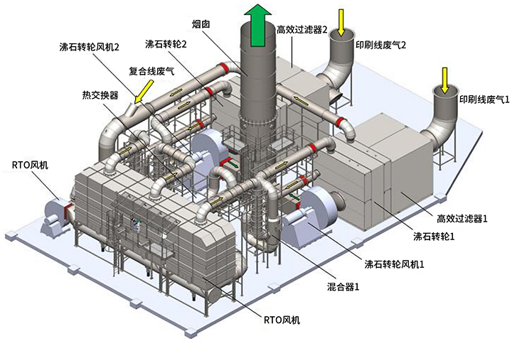 从2010年开始,与国内外专业的VOCs治理公司深入研究,分别设计不同的治理方案对印刷、复合等工艺产生的VOCs进行治理,VOCs废气稳定达标排放。其中针对印刷工序的VOCs治理,公司投资约4000万人民币,与国外专业的VOCs治理公司合作,引进具备世界先进水平的软包装VOCs治理系统,采用“沸石转轮浓缩+RTO燃烧+余热利用”的处理工艺,VOCs处理效率达95%以上,设计目标总VOCs排放浓度为50mg/m³,远低于现行广东省地方标准《印刷行业挥发性有机化合物排放标准》(DB44/815-2010)总VOCs最高允许排放浓度为120mg/m³的要求。